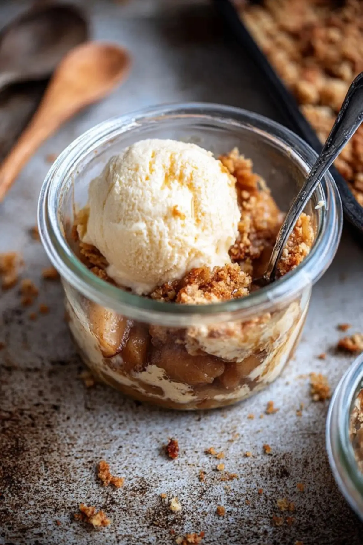 Bratapfel Apfel Crumble mit Vanilleeis ist ein himmlisches Winterdessert im Glas. Warme, zimtige Apfelstücke treffen auf knusprige Streusel und werden mit einer cremigen Kugel Vanilleeis serviert. Schnell zubereitet, perfekt für Gäste und die ganze Familie.