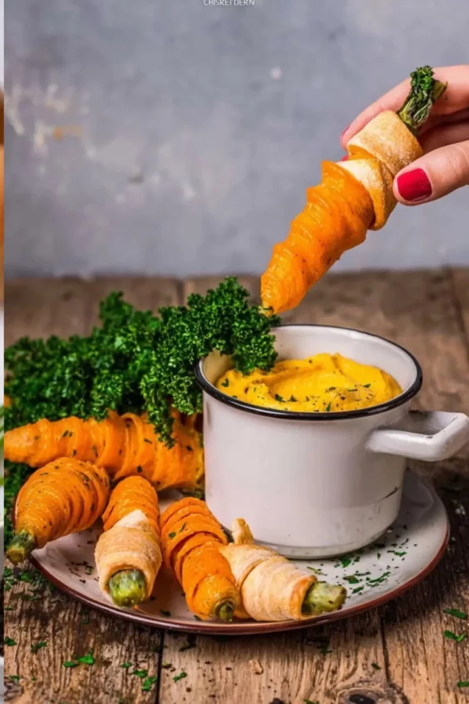 Vegane Oster Snack Karotten sind die perfekte Leckerei für dein Osterbuffet! Diese kleinen Snacks aus Blätterteig mit einem würzigen Kichererbsen-Dip bieten nicht nur einen visuellen Genuss, sondern sind auch schnell zubereitet und ideal für den Osterbrunch.