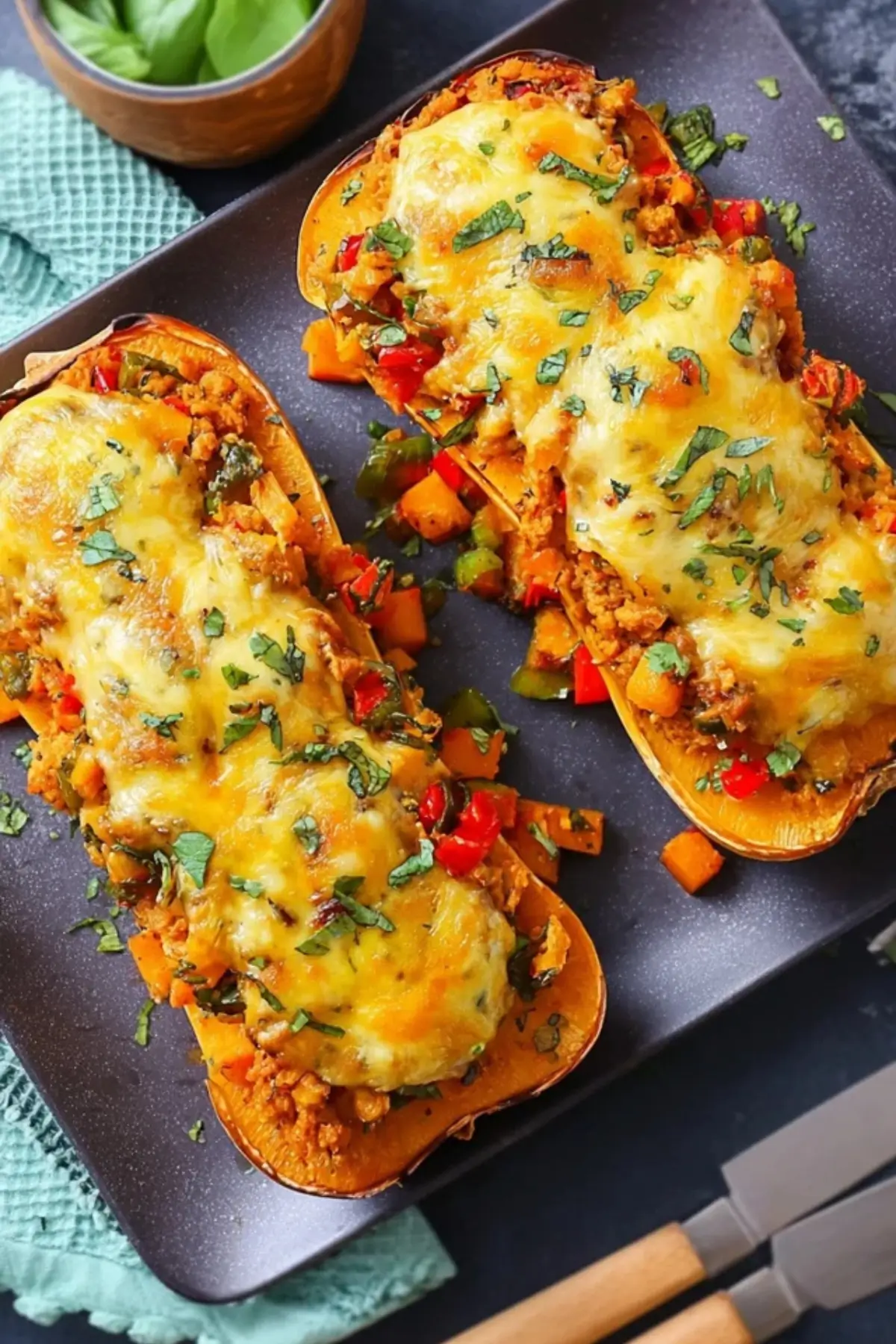 - Fülle die Kürbishälften mit der Gemüsemischung und bedecke sie mit veganem Käse.